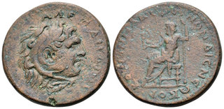 | Lot description: Macedon, Koinon Æ28. Circa 3rd Century AD. Head of Alexander to right, wearing lion skin headdress, ΑΛΕΞΑΝΔΡΟΥ before / KOINON MAKEDONΩN ΔIC NEΩKOP, Zeus seated left, holding sceptre and Nike in outstretched right hand. Cf. AMNG 408. 19.66g, 18mm, 6h. Good Fine. Estimate: 40 GBP |