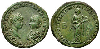 | Lot description: Elagabalus, with Julia Maesa, Æ Pentassarion of Marcianopolis, Moesia Inferior. AD 217-218. Julius Antonius Seleucus, consular legate. AVT K M AVR ANTΩNEINOC AVΓ IOYΛIA MAICA AVΓ, laureate head of Elagabalus right, facing diademed and draped bust of Maesa left / YΠ IOYΛ ANT CEΛEYKOY MAPKIANOΠOΛEITΩN, Hygeia standing right, feeding serpent from patera; E in left field. AMNG I 959; Hristova & Jekov 6.28.21.1 var. (spacing of legends); Varbanov 1632. 11.58g, 28mm, 1h. Near Extremely Fine. Well detailed and with an attractive patina. Estimate: 75 GBP |