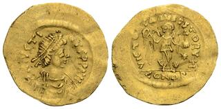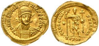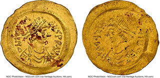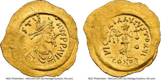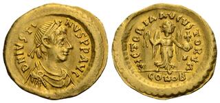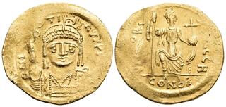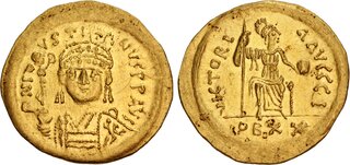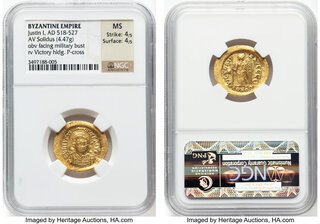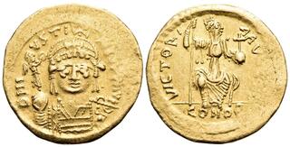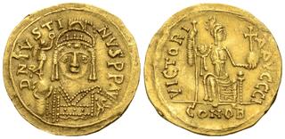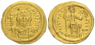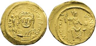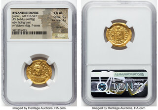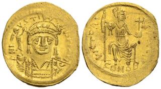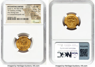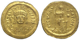 Justin II, 565-578. Solidus (Gold, 21 mm, 4.40 g, 6 h), Constantinople, H = 8th officina. D N IVSTI-NVS PP AVI Diademed, helmeted and cuirassed bust of Justin facing, holding Victory on globe in his upraised right hand, and shield decorated with horseman motif with his left. Rev. VICTORI-A AVCCC H/ CONOB Constantinopolis seated facing, head turned to right, holding spear in her right hand and globus cruciger in her left. DOC 4g. MIB 5. SB 345. Some flatness of strike; mildly wavy flan, otherwi... | 22 Feb 2026 | Upcoming Auction | |