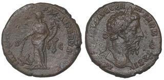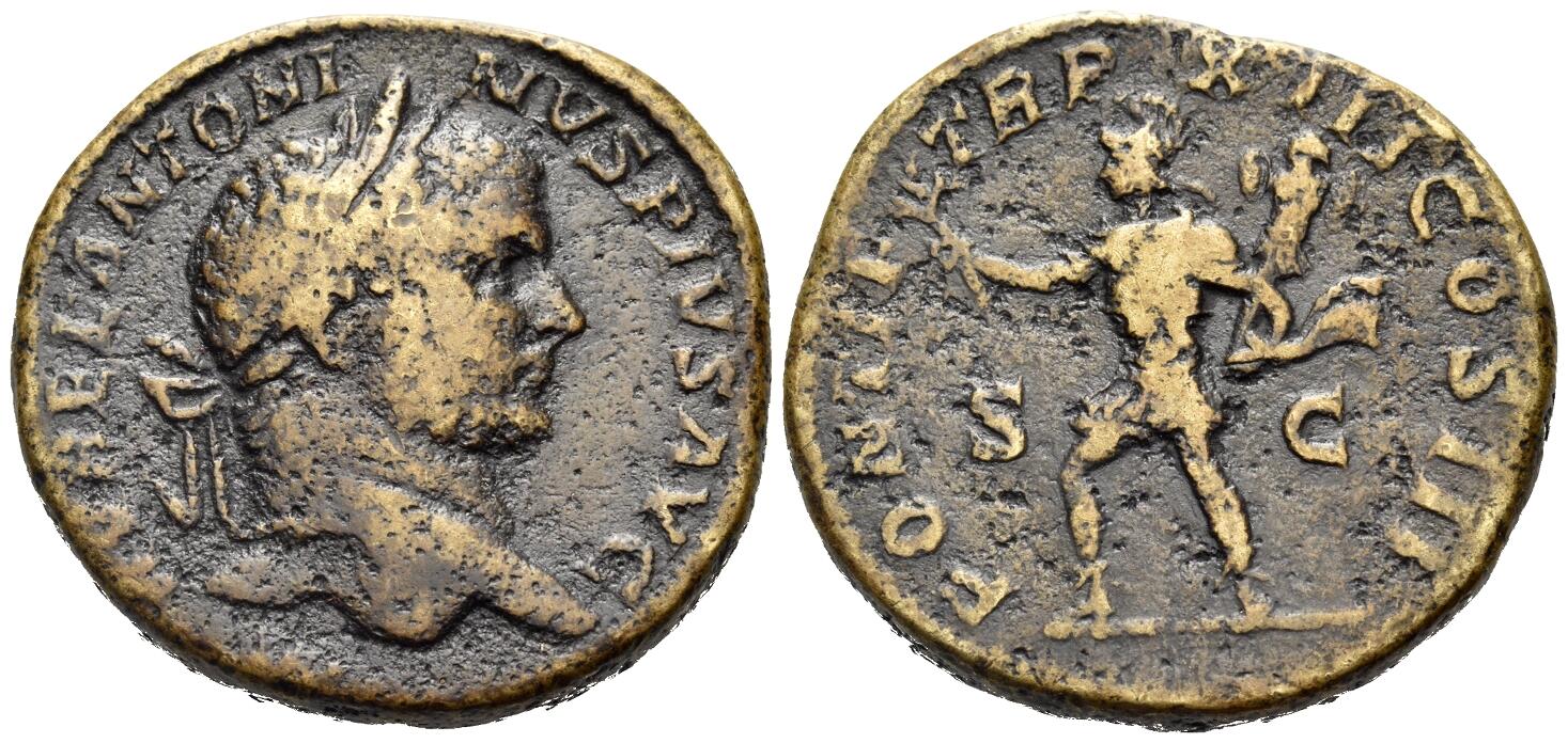 Caracalla, 198-217. Sestertius (Bronze, 30 mm, 22.89 g, 12 h), Rome, 210. M AVREL ANTONI-NVS PIVS AVG Laureate bust of Caracalla to right. Rev. PONTIF TR P XIII COS III Mars advancing to left, holding branch in right hand and trophy in left. BMC 202. Cohen 474. RIC 450a. Rough surfaces, otherwise, fine.