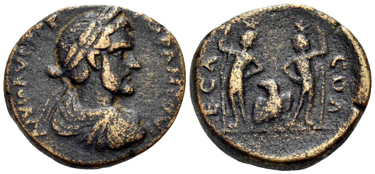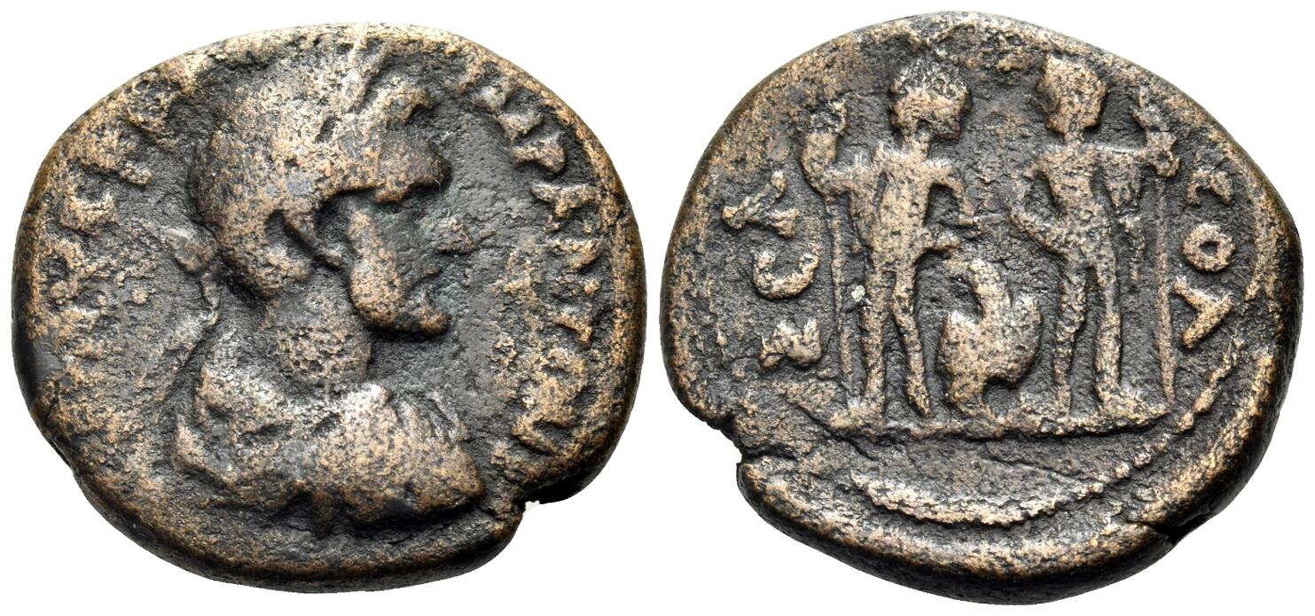 JUDAEA. Aelia Capitolina (Jerusalem). Antoninus Pius, 138-161. (Bronze, 22 mm, 9.06 g, 12 h). IMP ANTONI-NVS AVG P P P Laureate, draped and cuirassed bust of Antoninus Pius to right. Rev. CO AE CA The Dioskouroi, nude, standing facing, with their heads turned to face one another, both with a star above their heads, each holding a spear with their outer arm, and resting the other on their hip; between them, eagle standing facing with head turned to left. Meshorer 22. RPC IV.3, ID 6403 (temporar... | 22 Feb 2026 | Upcoming Auction | |