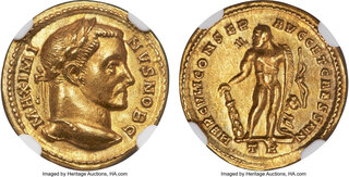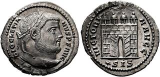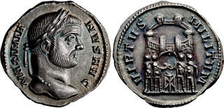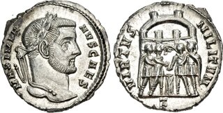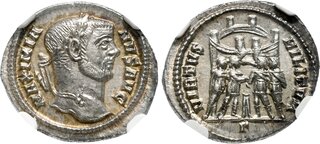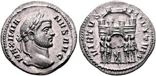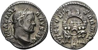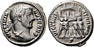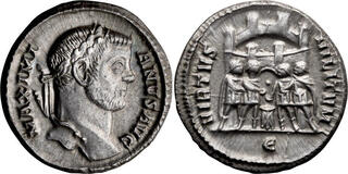 Maximianus. Argenteus; Maximianus; 286-305 AD, Argenteus, 3.09g. Cf. RIC-102b (Trier). Obv: MAXIMIA - NVS AVG Head laureate r. Rx: VIRTVS - MILITVM on l. and r., around type of the four tetrarchs sacrificing over tripod before gate in six-turreted enclosure. Attribution tentative; the same type in slightly different style was also struck at several other mints.Some iridescent toning. MS