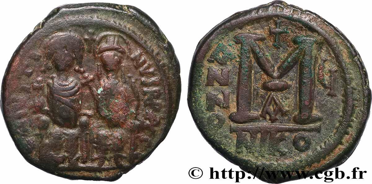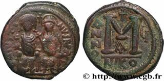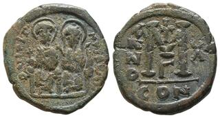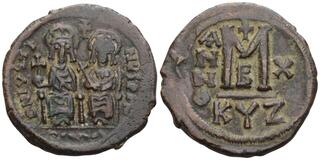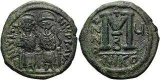 Justinus II., 565 - 578. Follis Jahr 10 (574 - 575), Kyzikos (Cyzicus), 2. Offizin. Zusammen mit Sophia, 573 - 578. D N IVSTI - NVS P P [AVG], sitzendes Kaiserpaar in Ornat von vorne. Rv. ANNO - X, Großes M, darüber Kreuz, darunter B, im Abschnitt KYZ. DOC 122. Sear 372. 8.04 g. Sehr schön / Very fine. Dunkle Patina / Dark patina.