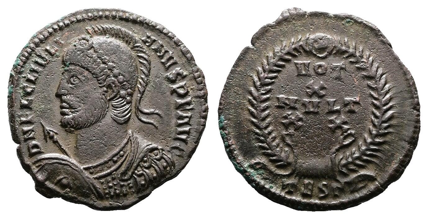 Julian II, AD 360-363. Bronze Follis (20 mm, 3.61 g.). Thessalonica mint, 3rd officina, struck 361-363 AD. DN FL CL IVLIA-NVS P F AVG, pearl-diademed, helmeted and cuirassed bust of Julian II to left, spear in right hand, shield in left. Rev. VOT X MVLT XX, in four lines within wreath; mintmark: (palm)TESΓ(palm) in exergue. RIC VIII 227; LRBC 1697.
