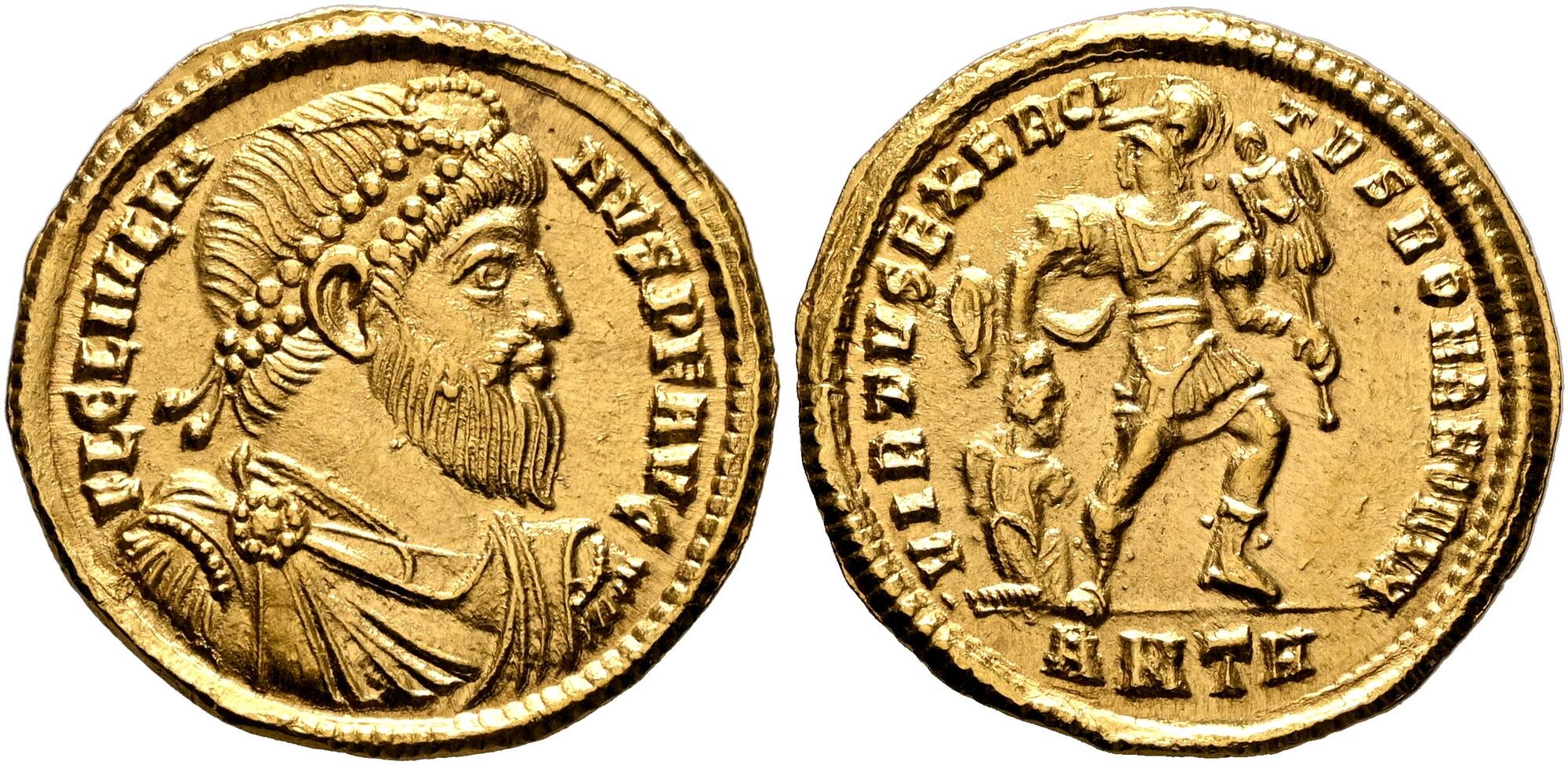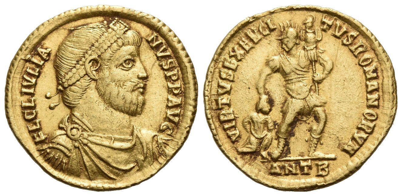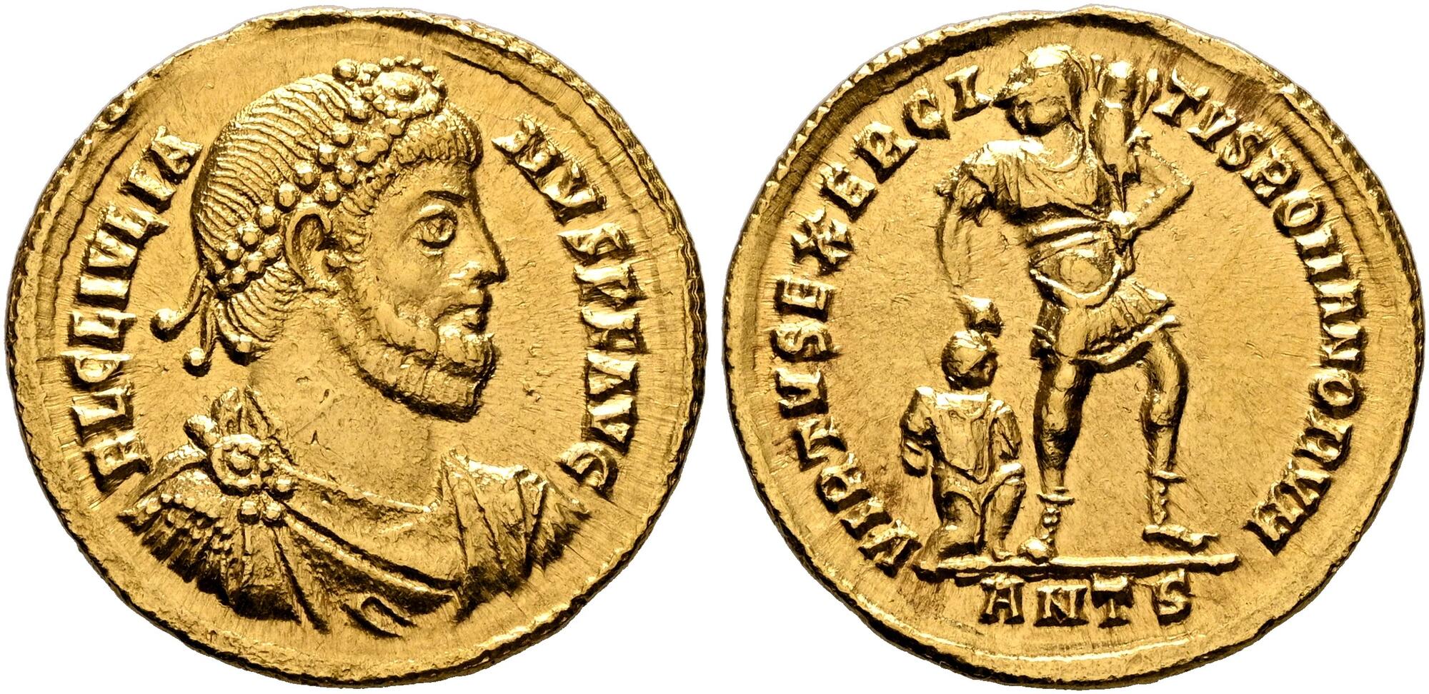 FL CL IVLIA – NVS P F AVG Pearl-diademed, draped and cuirassed bust r. Rev. VIRTVS EXERCI – TVS ROMANORVM Soldier, helmeted, standing r., holding trophy over l. shoulder and placing r. hand on head of kneeling captive; in exergue, ANTB. C 79. RIC 199. Depeyrot 15/1.