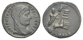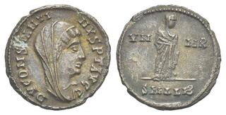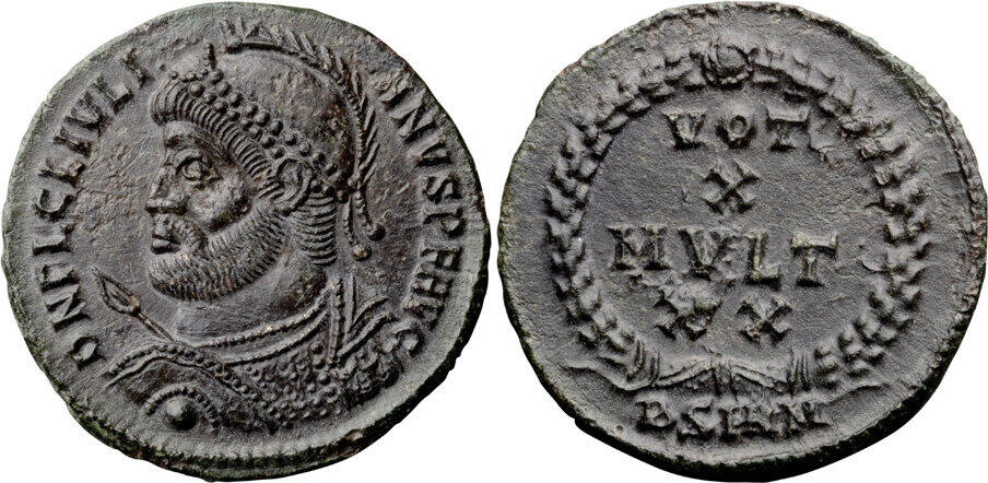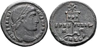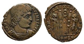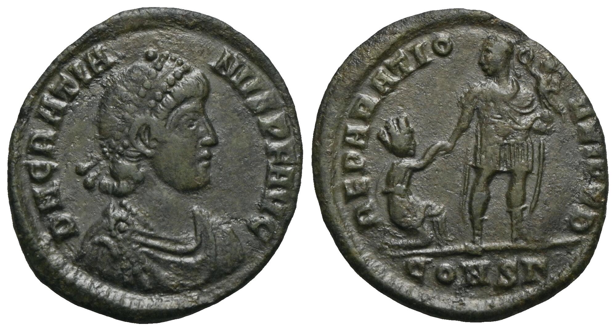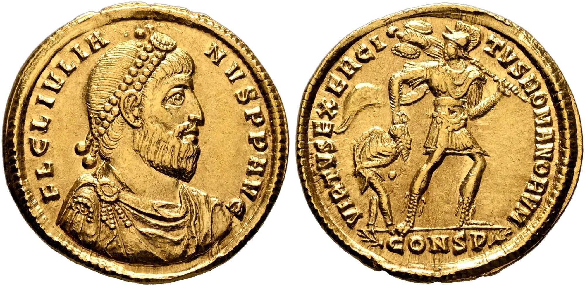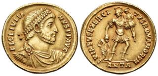 FL CL IVLIA – NVS P F AVG Pearl-diademed, draped and cuirassed bust r. Rev. VIRTVS EXERCI – TVS ROMANORVM Soldier, helmeted, standing r., holding trophy over l. shoulder and placing r. hand on head of kneeling captive; in exergue, ANTB. C 79. RIC 199. Depeyrot 15/1.