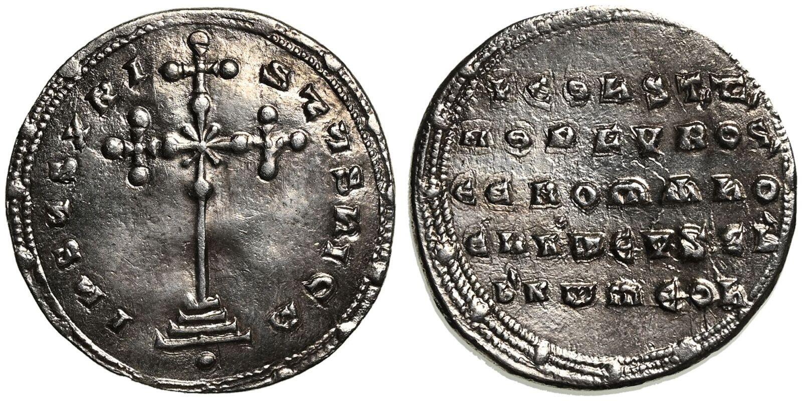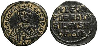 Obv: ‚ßæ LEO"∫ bASILEVS ROM', crowned facing bust, wearing chlamys and holding akakia. Rev: ‚ßæ L–ÑO"∫ –Ñ"∫ ΘΕΟ bASIL–ÑVS ROM–ÑO"∫ in four lines.