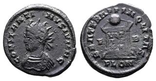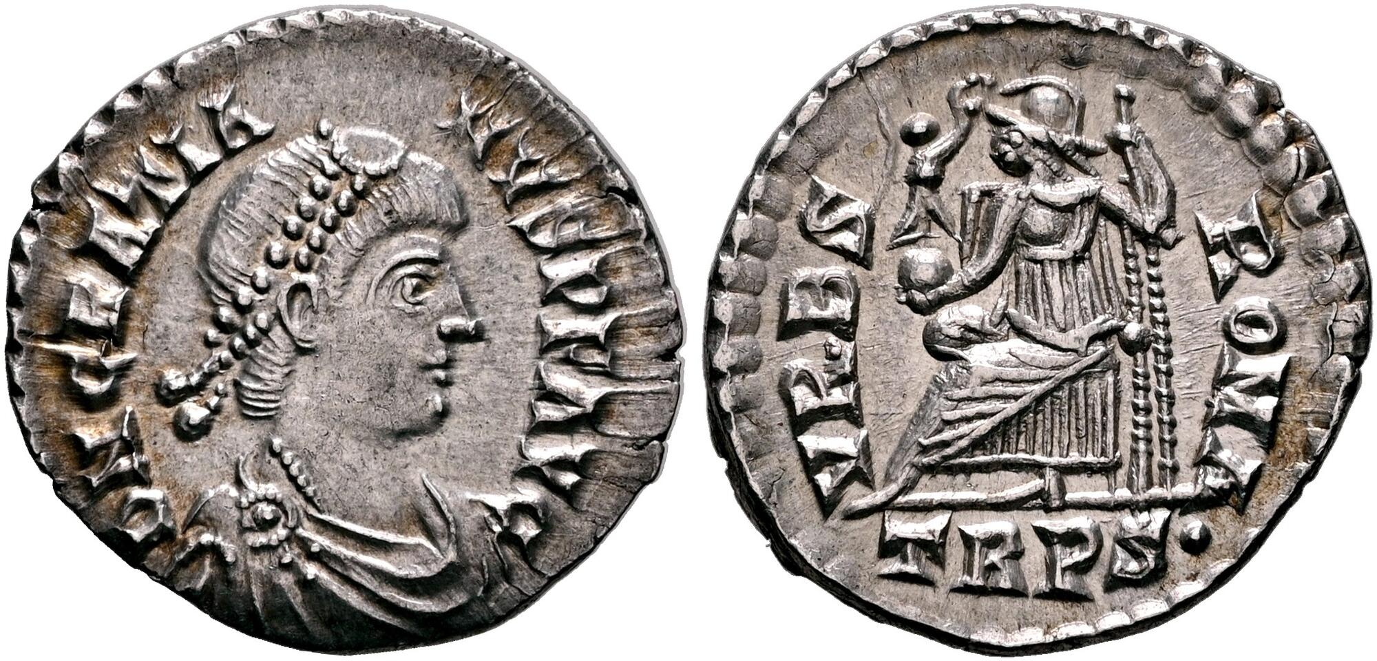 Av.: D N GRATIA-NVS P F AVG, gepanzerte und drapierte Büste mit Perlendiadem nach rechts. Rv.: REPARATIO REIPVB // CONSG, Kaiser mit Victoriola reicht kniender Frau mit Mauerkrone seine Hand. 4,23 g. RIC: 54a. Fast vorzüglich