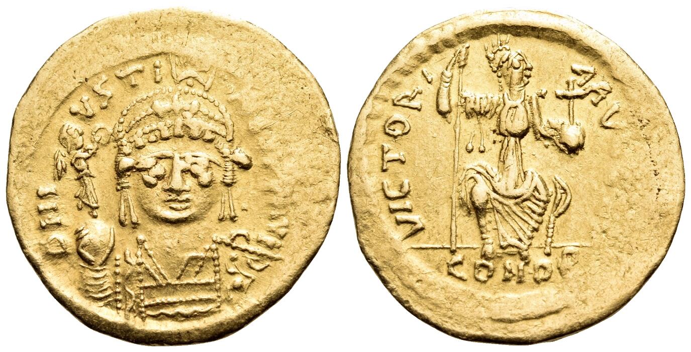 Justinus I. Thrax, 518 - 527. Solidus um 522 - 527, Konstantinopel, 1. Offizin. D N IVSTI - NVS P P AVG, gepanzertes Brustbild mit Helm, geschultertem Speer und Schild von vorne. Rv. VICTORI - A AVGGG A, stehende Victoria mit Langkreuz und Kreuzglobus von vorne, im Feld rechts Stern, im Abschnitt CONOB. DOC -. Sear 56. 4.30 g. Fast sehr schön / Nearly very fine. Druckstellen / Press marks.