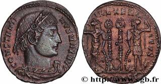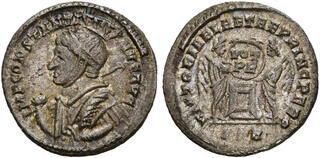 CONSTANTIN Ier Auguste (307-337), argenteus de billon, 318-319, Trèves. D/ IMP CONSTANTI-NVS AVG B. casqué, cuir. à g., ten. une lance sur l'épaule d. R/ VICTORIAE LAETAE PRINC PERP/ PTR Deux Victoires se faisant f., ten. entre elles un bouclier inscrit VOT/ PR posé sur un autel. RIC 208A. 2,51 g. Très rare. Traces d'argenture.