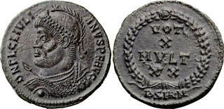 als Caesar 293-305. Argenteus (2,62 g), Roma, 6. Offizin, 295-297 n. Chr. Av.: MAXIMIA-NVS CAES, Kopf mit Lorbeerkranz n.r. Rv.: VICTORI-A SARMAT / S (im Abschnitt), die vier Tetrarchen opfern gemeinsam über Dreifuß, im Hintergrund Stadtmauerring mit sechs Türmen. RIC VI 38b, RSC V 208b. Kleine Stempelrisse im Av. und aus etwas müden Stempeln. s.sch.-vzgl.