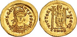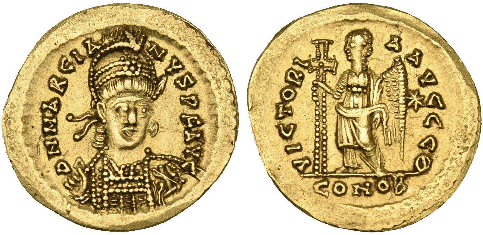 MARCIEN (450-457), AV solidus, Constantinople. Off. Θ. D/ DN MARCIA-NVS PF AVG B. casqué, cuir. de f., ten. une lance et un bouclier. R/ VICTORI-A AVGGGΘ/ CONOB Victoire deb. à g., ten. une longue croix. Dans le champ à d., une étoile. RIC 509; LRC 477 var.; Depeyrot 87/1. 4,33 g. Petit graffiti au droit. Légères traces de monture.
