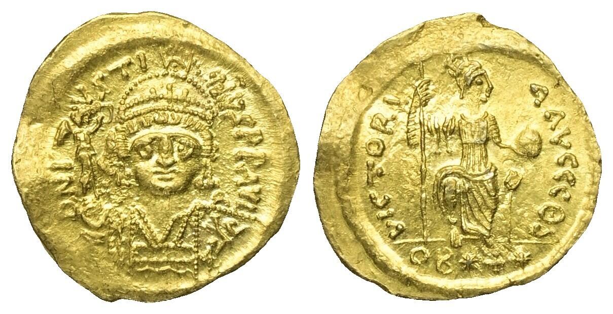 Tremissis (1,49 g), Constantinopolis, 565-578 n. Chr. Av.: D N IVSTI-NVS PP AVG, Büste mit Perlendiadem, Drapierung und Kürass n.r. Rv.: VICTORIA AVGVSTORVM / CON OB (im Abschnitt), Victoria mit Kranz und Kreuzglobus n.r., Kopf n.l., im r. Feld Stern. Sear 353, MIB 11a, Sommer 5.7. Prägeschwäche sowie kleine Kratzer und minimal wellig. vzgl./f.vzgl.