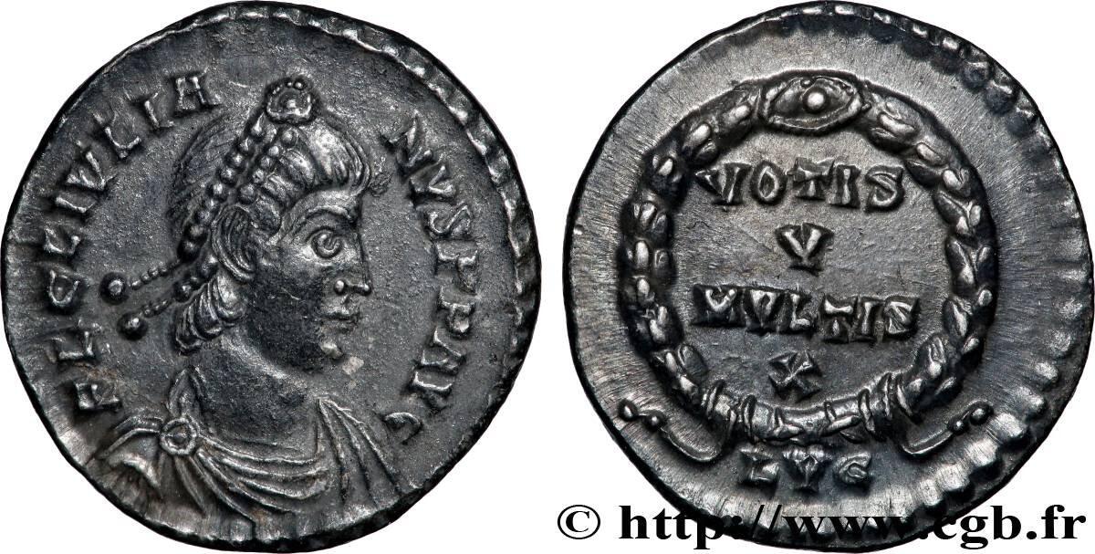 Julian II. Siliqua; Julian II; 360-363 AD, Lugdunum, Reduced Siliqua, 2.43g. RIC-227 (C3), officina P=1. Obv: FL CL IVLIA - NVS PP AVG Pearl-diademed, draped, cuirassed bust r., seen from front. Rx: VOTIS / V / MVLTIS / X in four lines in wreath, PLVG in exergue. From the East Harptree Hoard, 1887.. Toned MS