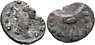 Argenteus (2,74 g), Siscia (Sisak), ca. 300 n. Chr. Av.: DIOCLETIA-NVS P F AVG, Kopf mit Lorbeerkranz n.r. Rv.: VICTORI-A AVGG / * SIS (im Abschnitt), Porta Praetoria mit vier turmartigen Aufbauten. RIC VI 68 var. (Av.-Legende), RSC V 484b var. (dito). Randausbruch geklebt sowie stellenweise leichte Korrosionsspuren und winziger Schrötlingsriss. Äußerst seltenes Exemplar. RRR f.vzgl.