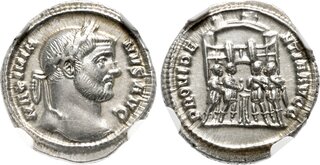Maximianus. Argenteus; Maximianus; 286-305 AD, Rome, c. 295-7 AD, Argenteus, 3.93g. RIC-40b (R2), officina E=5, RSC-622g. Obv: MAXIMIA--NVS AVG Head laureate r. Rx: VIRTVS MILITVM Four emperors sacrificing over tripod altar before gate of six-turreted enclosure, E in exergue. Ex CNG E465, 5 April 2020, lot 507.. MS