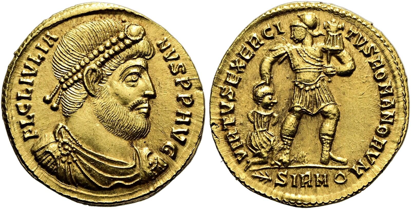 Julian II., 360 - 363 n. Chr. Solidus ø 21mm (4,44g). 361 - 363 n. Chr. Mzst. Sirmium. Vs.: FL CL IVLIA-NVS P P AVG, drapierte Panzerbüste mit Perlendiadem n. r. Rs.: VIRTVS EXERCI-TVS ROMANORVM / SIRM u. Kranz, Kaiser als Soldat mit Tropaeum greift einem gefesselten, knienden Gefangenen an den Kopf. RIC VIII, 99A; C. 78; Depeyrot 22/1.