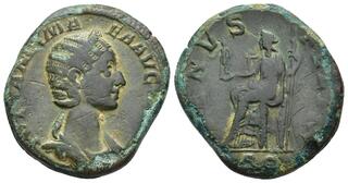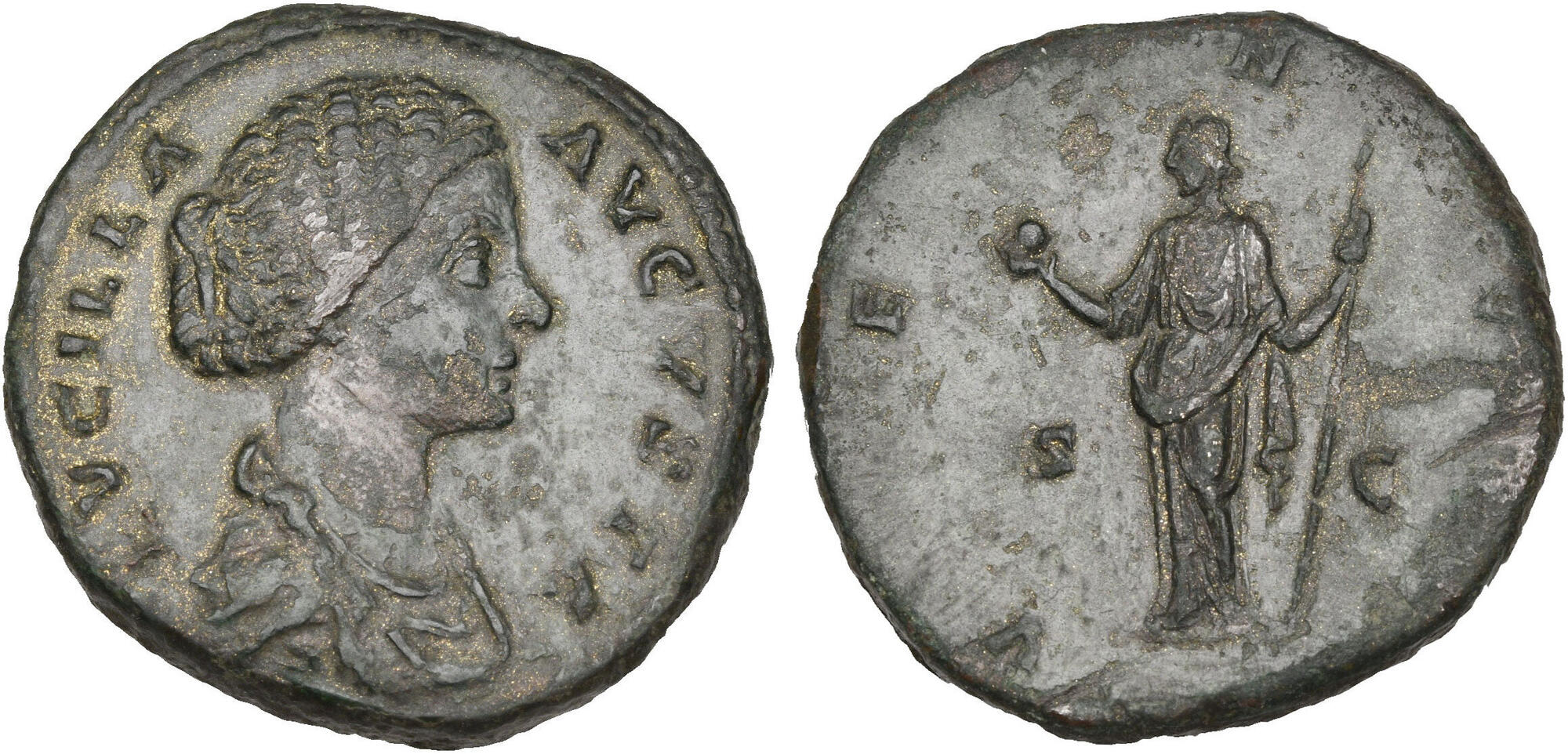 LUCILLA, femme de Lucius Verus, AE sesterce, Rome. D/ LVCILLA- AVGVSTA B. dr. à d. R/ VE-NVS/ S-C Vénus deb. à g., ten. une pomme et un sceptre. BMC p. 578 *; RIC 1765; C. 74. 20,51 g. Traces de corrosion au revers. Champs polis. Types retouchés. Patine verte.