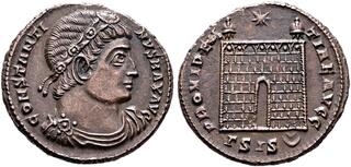Rs: VICTORI - A AVGGG Theta S. Constantinopolis mit Lanze und Kreuzglobus en face thronend. Im Abschnitt: OB *+*.