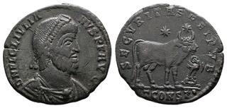 Julian II, AD 360-363. Bronze Double Maiorina (28 mm, 8.51 g.). Arelate mint. D N FL CL IVLIA-NVS P F AVG, pearl-diademed, draped and cuirassed bust of Julian II to right. Rev. SECVRITAS REI PVB / TCONST•, bull standing right; above, two stars; to right, eagle standing front on wreath with spread wings, head turned to left, holding wreath in beak. RIC 320. Good very fine.