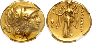 KINGS of MACEDON. Philip III Arrhidaios. 323-317 BC. AV Distater (22mm, 17.20 g). Amphipolis mint. Struck under Antipater or Polyperchon, circa 322-317 BC. Head of Athena right, wearing crested Corinthian helmet decorated with coiled serpent, single-pendant earring, and linear and pelleted necklaces / AΛEΞANΔPOY, Nike standing left, holding wreath in extended right hand and cradling stylis in left arm; vertical thunderbolt in left field. Price 163; Troxell, Studies, Group C, 545 (same dies). I... | 23 Sep 2025 | 37,500 USD | |