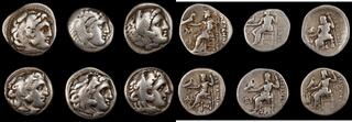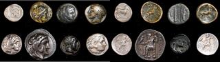 A variety of Macedonian issues in silver and bronze, including the types of Alexander I, Philip II, Alexander III, and Philip III. Consists of four bronze units, a silver Tetrobol, two Drachmae, and one Tetradrachm.