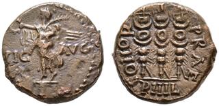 VIC AVG Nike standing l. on base, holding wreath and palm. Rev. COHOR PRAE / PHIL Three standards. RPC 1651