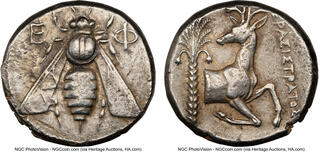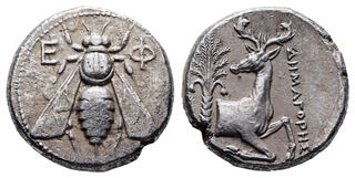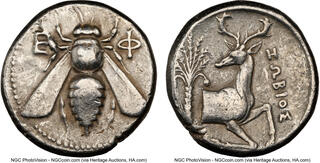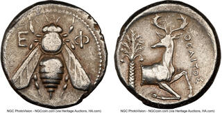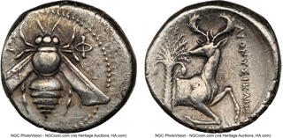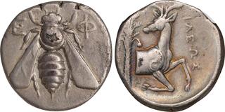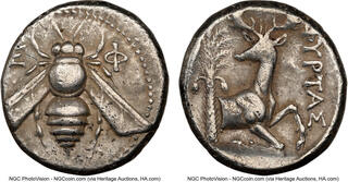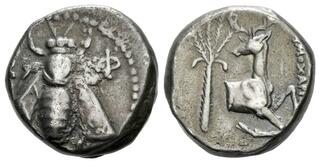 Tetradrachm, magistrate Demoxaris circa 350-340, AR 22 mm, 15.07 g. E – Φ Bee with straight wings. Rev. Forepart of stag r., head l.; in l. field, palm tree and in r. field, [ΔH]MOXAP[IΣ]. SNG Keckman 211. Pixodaros p. 184, obverse 161.