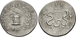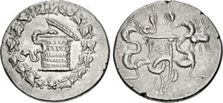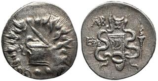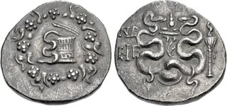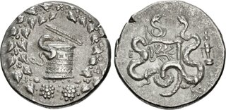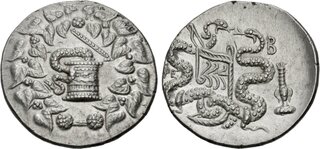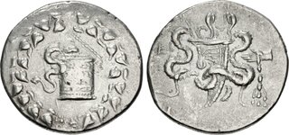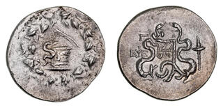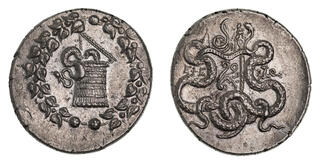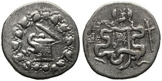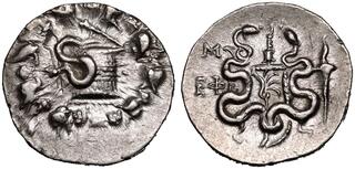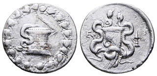 Obv: serpent emerging from cista mystica; all within ivy wreath. Rev: two serpents entwined around bow and bowcase; M (date) left, candelabrum above, torch right.