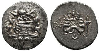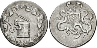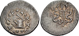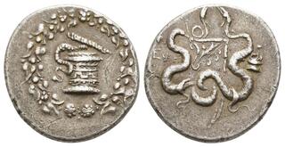 Obv: serpent emerging from cista mystica; all within ivy wreath. Rev: two serpents entwined around bow and bowcase; tripod above, ΛΔ (date) over EΦE in left field, torch in right field.