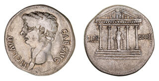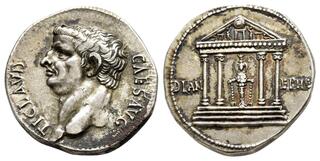 Cistophoric tetradrachm, Ephesus 41-42, AR 27 mm, 11.09 g. TI CLAVD – CAES AVG Bare head l. Rev. DIAN – EPHE Tetrastyle temple within which cult statue of Diana Ephesia. C 30. BMC 229. RIC 118. CBN 298. Banti, Corpus Nummorum Romanorum 267/1 = 267/3 (this coin). RPC 2222.