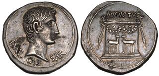 Obv: IMP•CAESAR, bare head right. Rev: garlanded and filleted altar decorated with stags standing vis-à-vis; AVGVSTVS above.