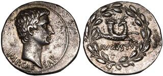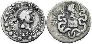 Obv: M ANTONIVS IMP COS DESIG ITER ET TERT, head of Antony right, wearing ivy wreath, lituus below; all within wreath of ivy and flowers. Rev: III VIR R P C, head of Octavia atop cista mystica between twisting snakes.