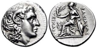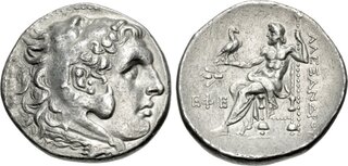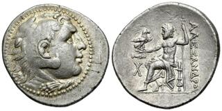 Tetradrachm in name and types of Alexander III circa 200-190, AR, 32 mm, 16.91 g. Head of Heracles r., wearing lion skin headdress. Rev. ΑΛΕΞΑΝΔΡΟΥ Zeus seated l., holding eagle and sceptre; in l. field,quiver above X. Price 1884. N. Olçay, H. Seyrig, Trésors monétaires séleucides. I: Le trésor de Mektepini en Phrygie. (Paris), 348.