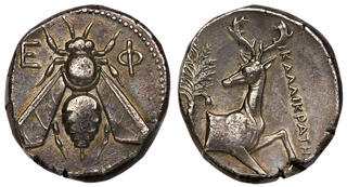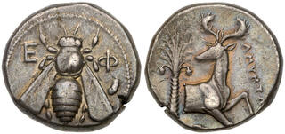Tetradrachme 350/340 v. Chr., Magistrat Artemon. Biene mit geraden Flügeln / Hirschprotome im Knielauf nach rechts, den Kopf zurückgewandt, links Dattelpalme, rechts Beamtenname. 12h. Pixodarus Hoard, S. 204, Klasse G (andere Stempel); Head, Ephesus, S. 34. 14.81 g.; 23,5 mm. Kabinettstönung Selten Sehr schön - vorzüglich