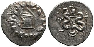 Obv: serpent emerging from cista mystica; all within ivy wreath. Rev: two serpents entwined around bow and bowcase; IB (date) above EΦE to left, lit torch to right, cap of the Dioscuri surmounted by star above.