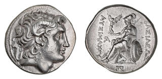 KINGS of THRACE, Macedonian. Lysimachos. 305-281 BC. AR Tetradrachm (29.5mm, 16.62 g, 11h). Uncertain mint. Diademed head of the deified Alexander right, with horn of Ammon / Athena Nikephoros seated left, left arm resting on shield, transverse spear in background; monograms to inner left and in exergue. Thompson –; Müller 436 var. (left field monogram retrograde; Ephesos); cf. HGC 3, 1750 (for type); Meydancikkale 2717 var. (same; same obv. die; Kyzikos?). Iridescent tone, some verdigris. Nea... | 18 Feb 2026 | Upcoming Auction | |