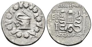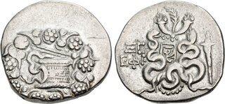 Obv: serpent emerging from cista mystica; all within ivy wreath. Rev: two serpents entwined around bow and bowcase; MC (date) above EΦE to left, lighted torch to right, headdress of Isis above.