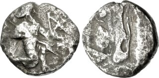 Tetradrachm, magistrate Pythagores, uncertain mint in Western Asia Minor circa 350-333, AR 24 mm, 15.19 g. Persian king, wearing kidaris and kandys, in kneeling-running stance r., holding spear in r. hand, bow in l.; [Π]YΘAΓ-O-P-H[Σ] around. Rev. Incuse rectangle, containing pattern possibly depicting relief map of the hinterland of Ephesos. Johnston, Earliest 1–4 var. (orientation of legend). Meadows, Administration 328 = BMC Ionia p. 323, ... | 5 Nov 2025 | 24,000 CHF | |