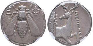 IONIA. Ephesus. Ca. 4th century BC. AR tetradrachm (23mm, 15.25 gm, 1h). NGC Choice VF 4/5 - 3/5, brushed. Ca. 350-340 BC, Erasistratus, magistrate. E-Φ, bee with straight wings seen from above / EPAΣIΣTPATOΣ, forepart of stag kneeling right, head reverted; palm tree in left field. Kinns, Ephesus, Pixodarus Hoard in: Coin Hoards IX (2002), Class G, pg. 204. Butterscotch backlight.