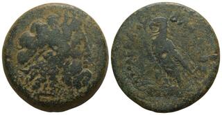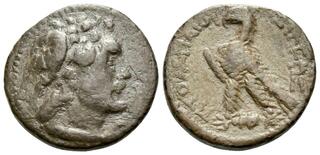 Diademed bust of Ptolemy I r., with aegis. Rev. Eagle standing l. on thunderbolt; below, [regnal year PE (105)]. Svoronos 1212. SNG Copenhagen 552.