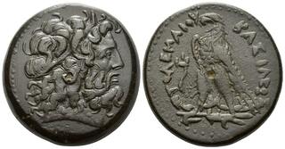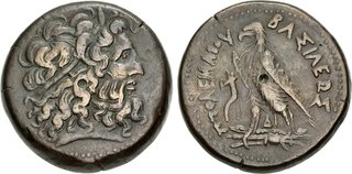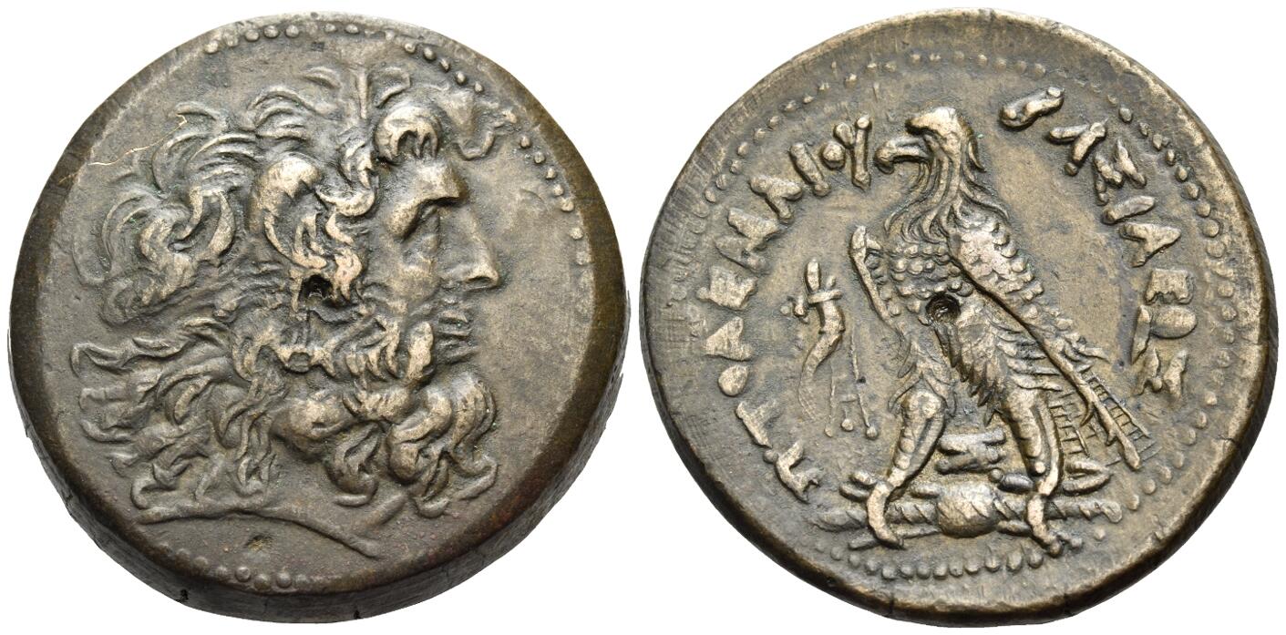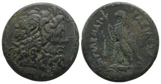 Head of Zeus-Ammon right, wearing taenia / ΒΑΣΙΛΕΩΣ ΠΤΟΛΕΜΑΙΟΥ, eagle with closed wings standing left on thunderbolt; filleted cornucopia to left, chi-rho monogram between legs.
