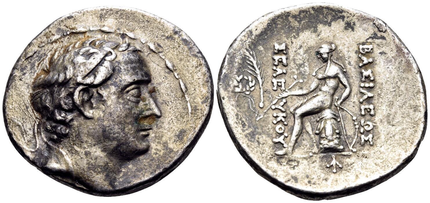 SELEUKID KINGS. Seleukos IV Philopator, 187-175 BC. Tetradrachm (Silver, 30 mm, 16.61 g, 12 h), Antioch on the Orontes. Diademed head of Seleukos IV to right. Rev. ΒΑΣΙΛΕΩΣ / ΣΕΛYKOY Apollo seated to left on omphalos, holding an arrow in his right hand and grounded bow in his left; to left field, filleted palm branch and wreath; to exergue, monogram consisting of ΔΙ. HGC 9, 580e. SC 1313.1. Some scratches and porosity, otherwise, very fine.