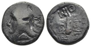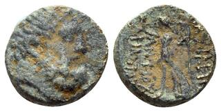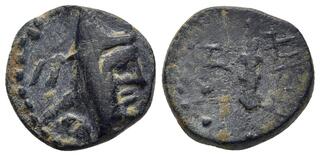 SELEUKID KINGS. Antiochos IX Eusebes Philopator (Kyzikenos), 114/3-95 BC. (Bronze, 11.5 mm, 1.56 g, 12 h), Antioch on the Orontes, Second reign, 110-109. Laureate and bearded head of Herakles to right. Rev. ΒΑΣΙΛΕΩΣ ΑΝΤΙΟΧΟΥ / ΦIΛOΠATOΡOΣ Nike advancing to left, holding wreath in her extended right hand and palm branch in her left. HGC 9, -. SC -. Extremely rare. An unpublished fraction of the Herakles/Athena issue of Antioch during the second reign of Antiochos IX. Green patina. Red earthen d... | 20 Jul 2025 | 420 CHF | |