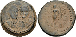 SELEUKID EMPIRE. Seleukos IV Philopator. 187-175 BC. Æ (24mm, 11.09 g, 5h). Ekbatana mint. Draped busts of the Dioskouroi, side by side, facing; one on the left slightly right, one on the right slightly left; each wearing laureate pileos / Nike advancing left, holding wreath and palm frond; monograms to inner left. SC 1357; HGC 9, 590. Earthen dark brown patina, flan preparation marks. Near VF. Very rare.