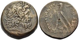 PTOLEMAIC KINGS OF EGYPT. Ptolemy IV Philopator, 225-205 BC. Drachm (Bronze, 43 mm, 75.70 g, 12 h), Alexandria, 224-220/219 BC. Horned head of Zeus-Ammon to right, wearing tainia. Rev. ΒΑΣΙΛΕΩΣ ΠΤΟΛΕΜΑΙΟΥ Eagle standing to left on thunderbolt; between legs, ΛΙ; in left field, cornucopia tied with royal diadem. CPE B493. SNG Copenhagen 199-200. Svoronos 1126. Brown patina. Usual flan production marks present, otherwise, good very fine.