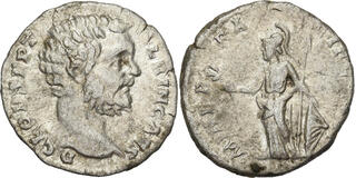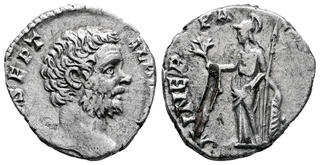 Clodius Albinus. Denarius. 194-195 AD. Rome. (Ric-IV 7). (Bmcre-95). (Tesorillo-Clod. Albino 1, Plate Coin). Anv.: (D CLOD) SEPT ALB(IN CAES). Bare head to right. Rev.: MINER PA(CIF COS II). Minerva, helmeted, standing to left, holding olive branch and shield set on ground; spear leaning against her arm . Ag. 2,34 g. Strong knock on reverse. Ex Ancient Delights, at the present Mayor 25. Madrid Numismatic convention (September 2004). Choice VF. Est...150,00.