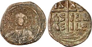 Anonymous Issue. Class B. Time of Romanus III and Michael IV (ca. AD 1028-1042). AE follis (33mm, 6h). NGC VF. Constantinople. IC-XC , bust of Christ facing, wearing nimbus cruciger with five pellets in each limb, pallium and colobium, right hand raised in benediction, book of Gospels in left / IS-XS / BAS-ILE / BAS-ILE cross potent on two steps. Sear 1823. Shimmery russet highlights on reverse. www.HA.com/TexasAuctioneerLicenseNotice