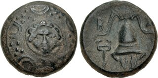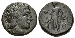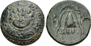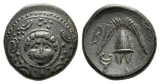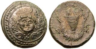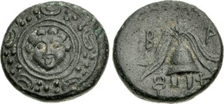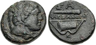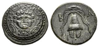 Struck under Nikokreon. Obv: Macedonian shield, with facing gorgoneion on boss. Rev: Macedonian helmet; B-A across fields; kerykeion to lower left.