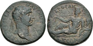 CARIA, Antiochia ad Maeandrum. Trajan. AD 98-117. Æ (29mm, 18.64 g, 12h). Laureate head right / River-god Maeandros recling left, holding reed and cornucopia; leaning on overturned amphora from which water flows. RPC III 2241.2 (this coin); Lindgren & Kovacs 608 (this coin). Green-brown patina, minor roughness, scrape on obverse. Fine.